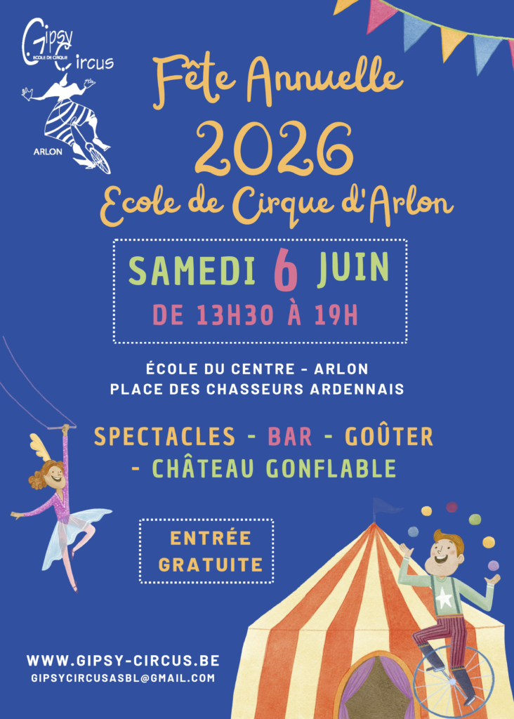 Nous sommes ravis de vous inviter à la fête annuelle de l’école de cirque Gipsy Circus d’Arlon le samedi 6 juin. Découvrez le programme dans notre affiche ci-dessous!
